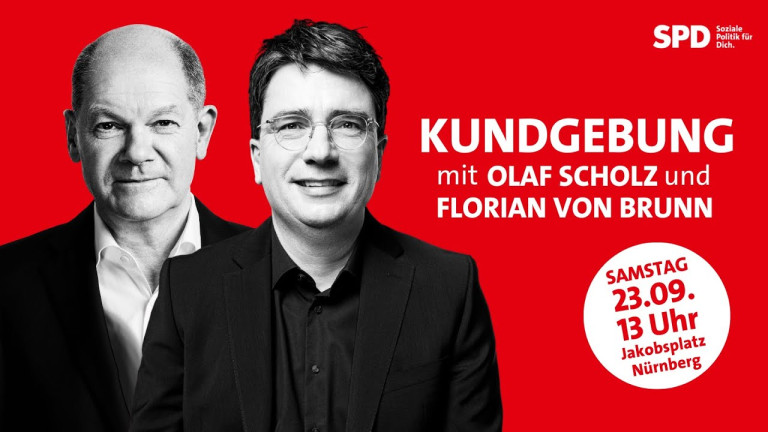 Olaf Scholz und SPD-Spitzenkandidat Florian von Brunn sprechen live auf dem Jakobsplatz in Nürnberg.